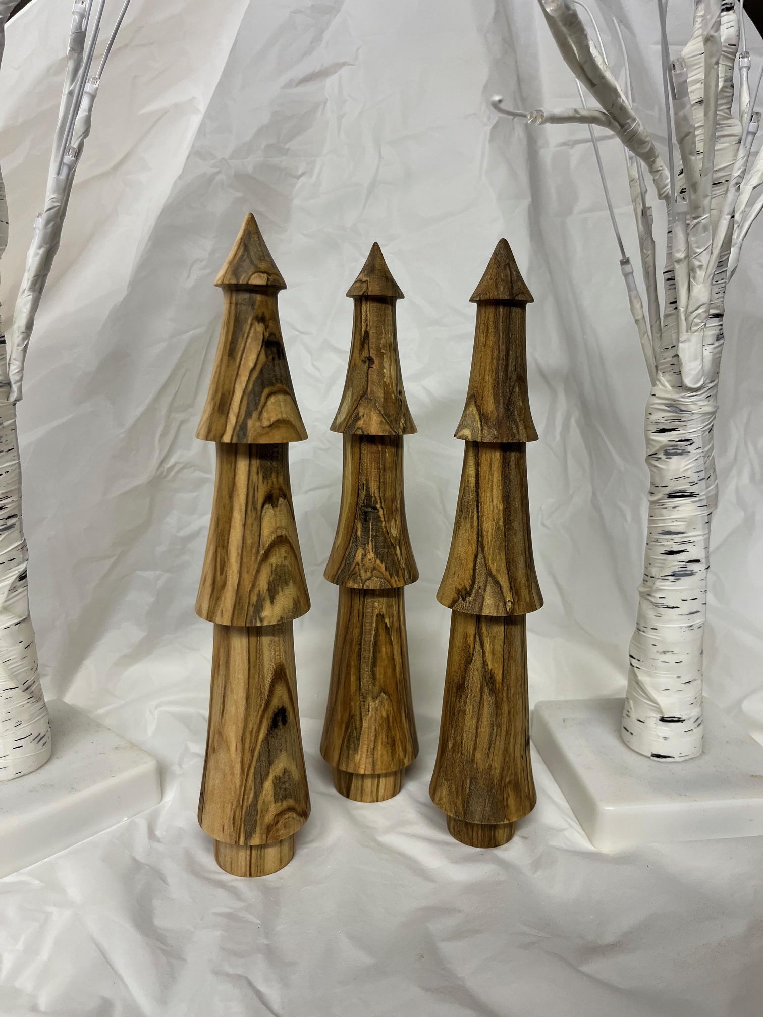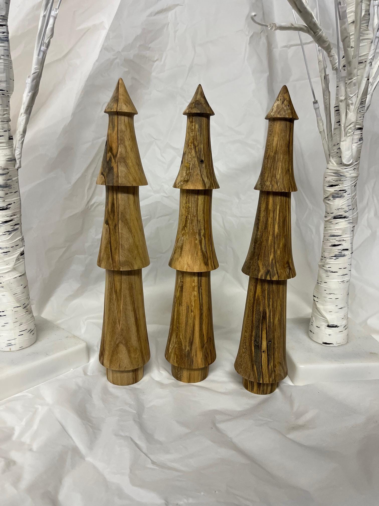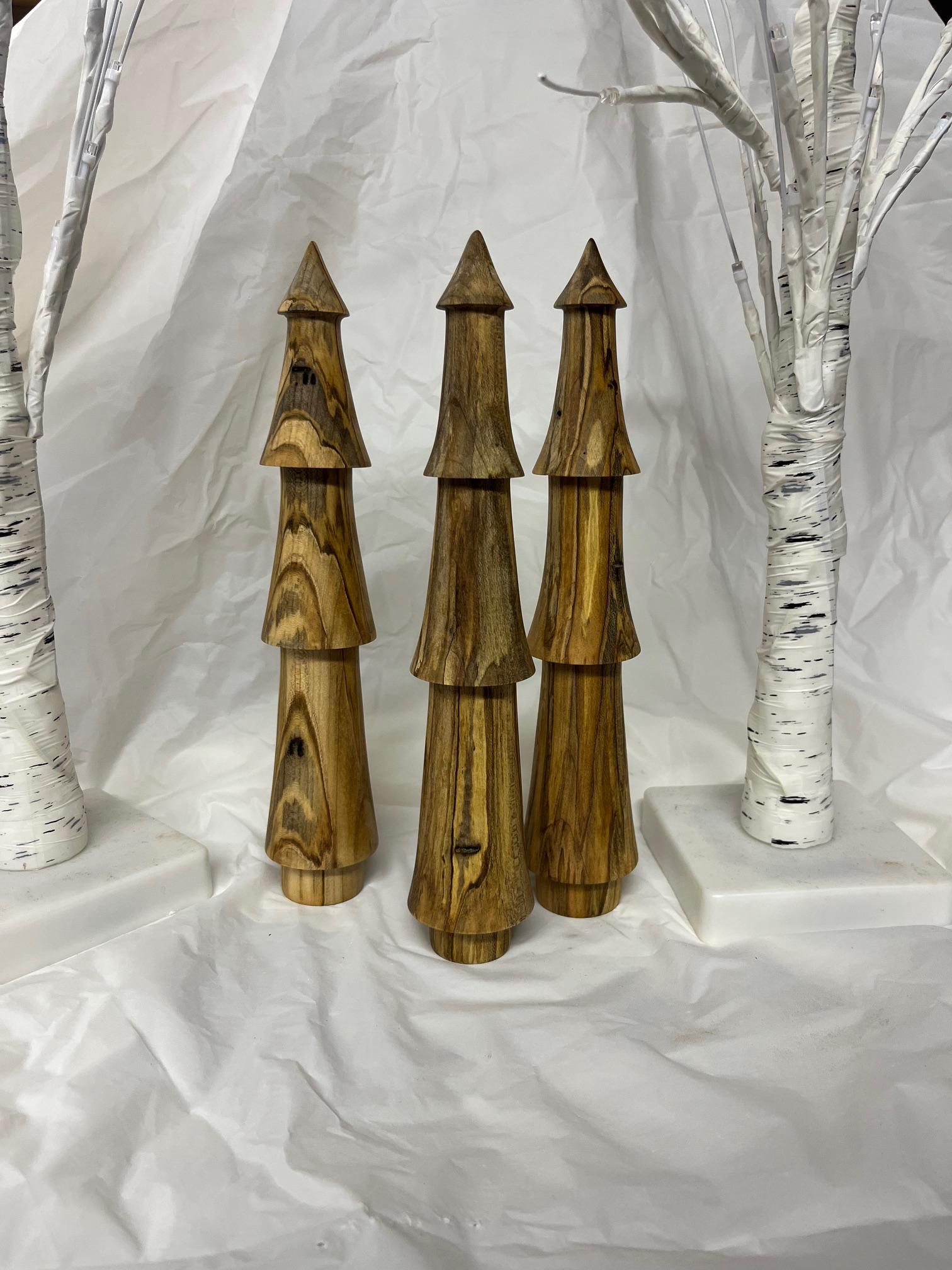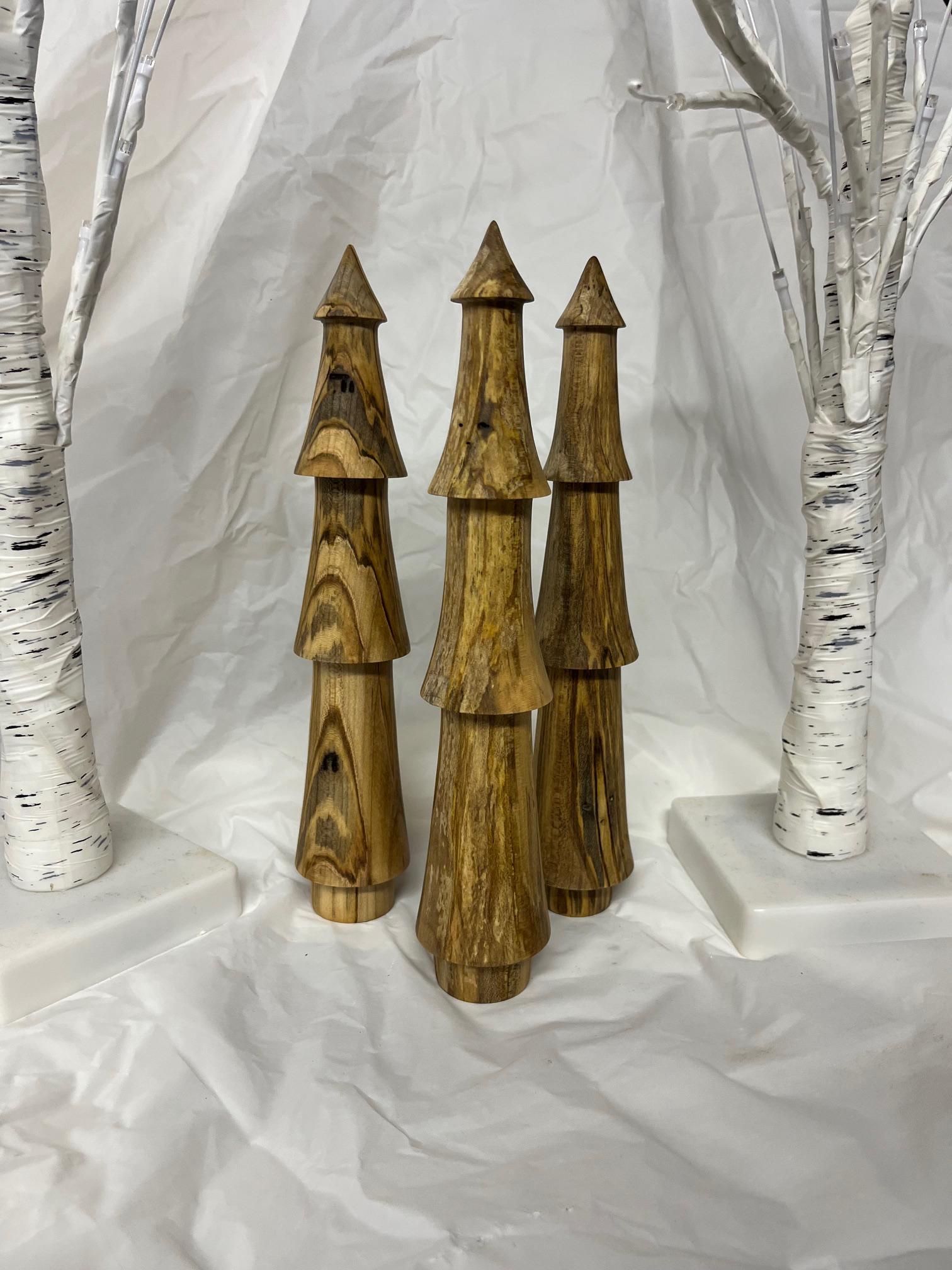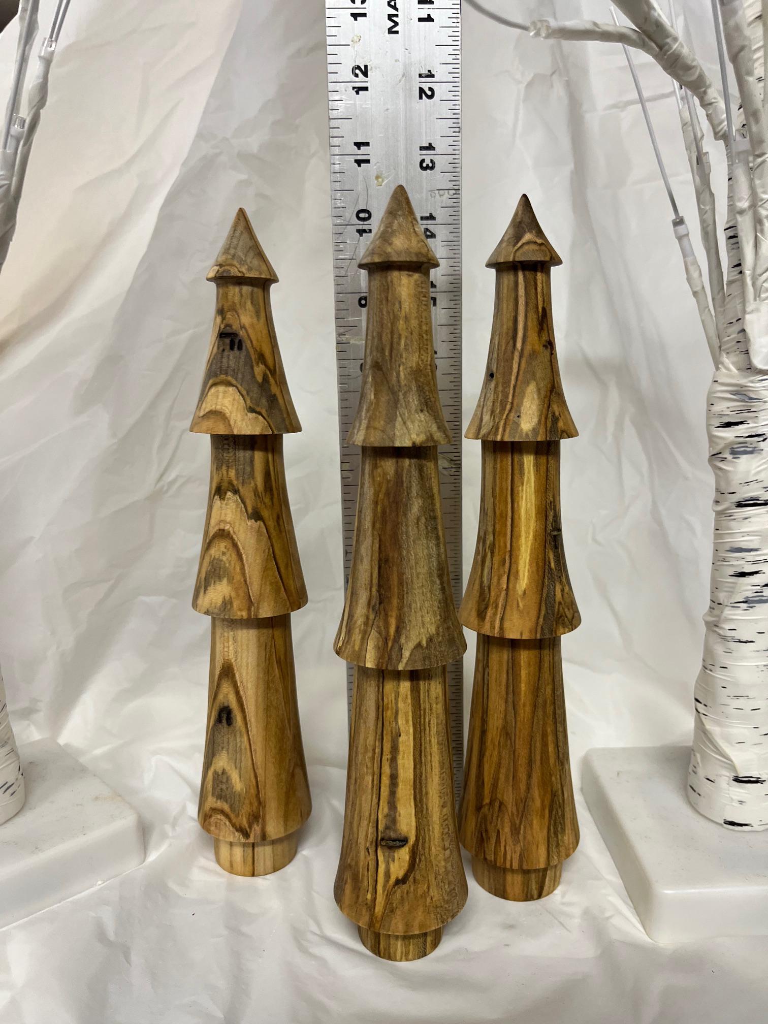 3 Handcrafted Ambrosia Maple Christmas Trees. each one slightly different... The wood has a rustic look with spalting and worm holes on some trees... see pictures for sizing.. standard ruler used