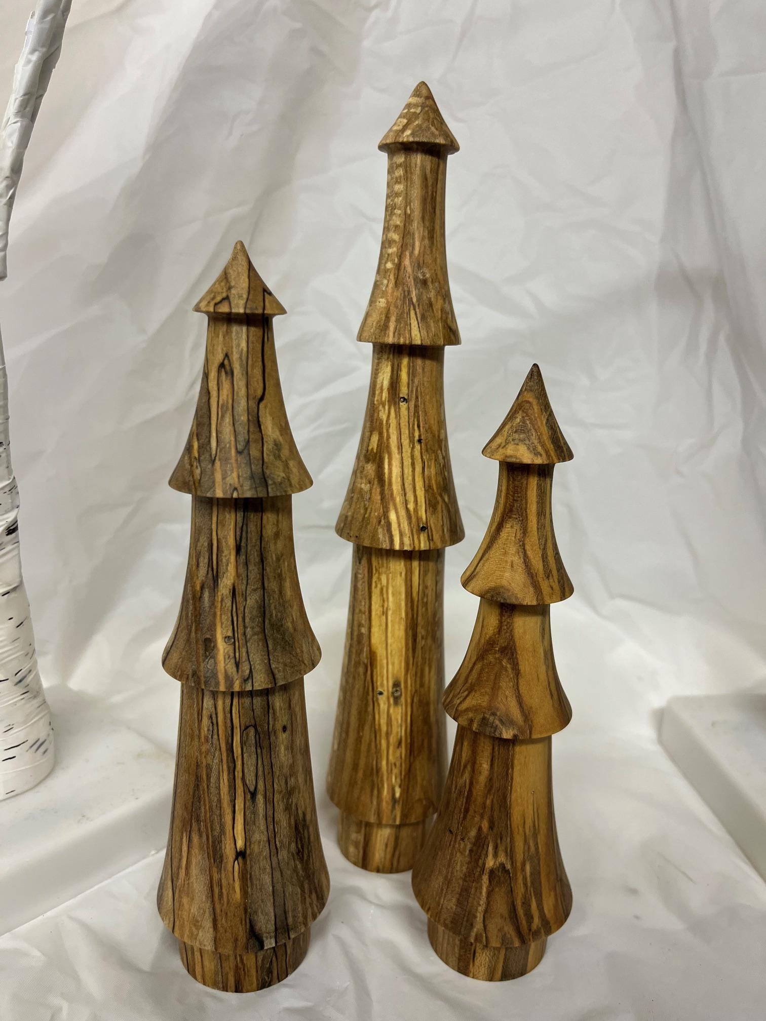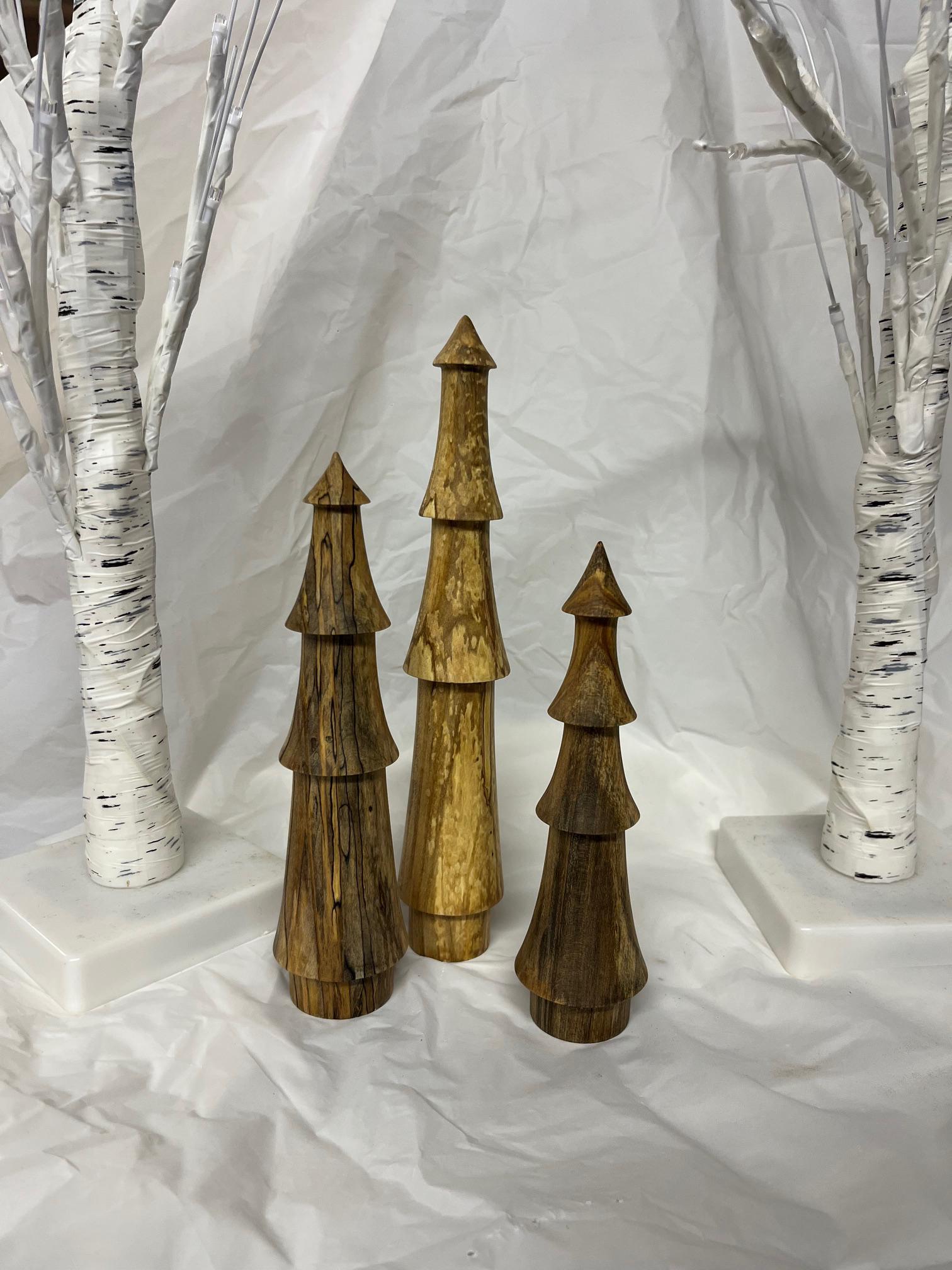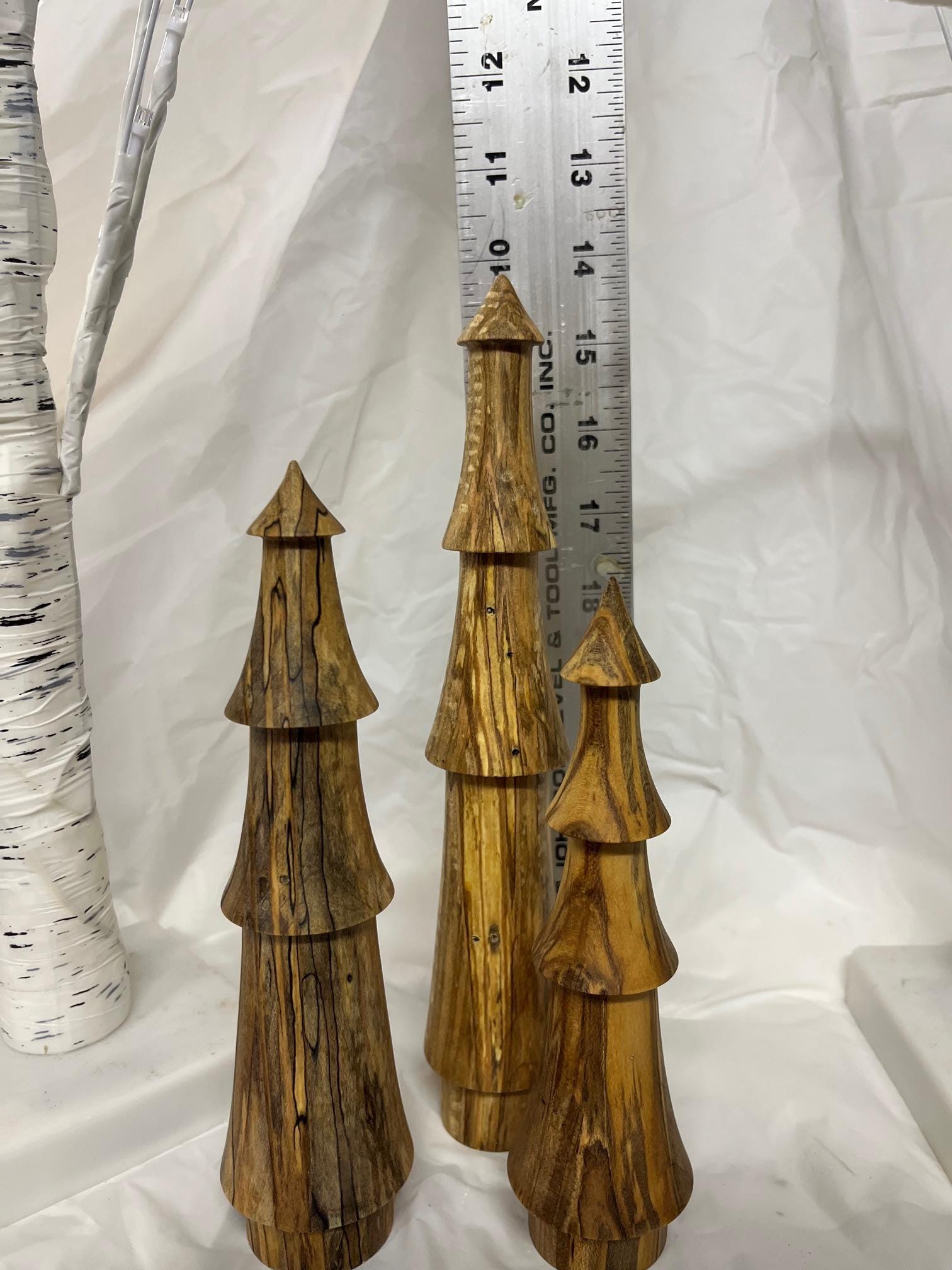 3 Handcrafted Ambrosia Maple Christmas Trees. each one slightly different... The wood has a rustic look with spalting and worm holes on some trees... see pictures for sizing.. standard ruler used