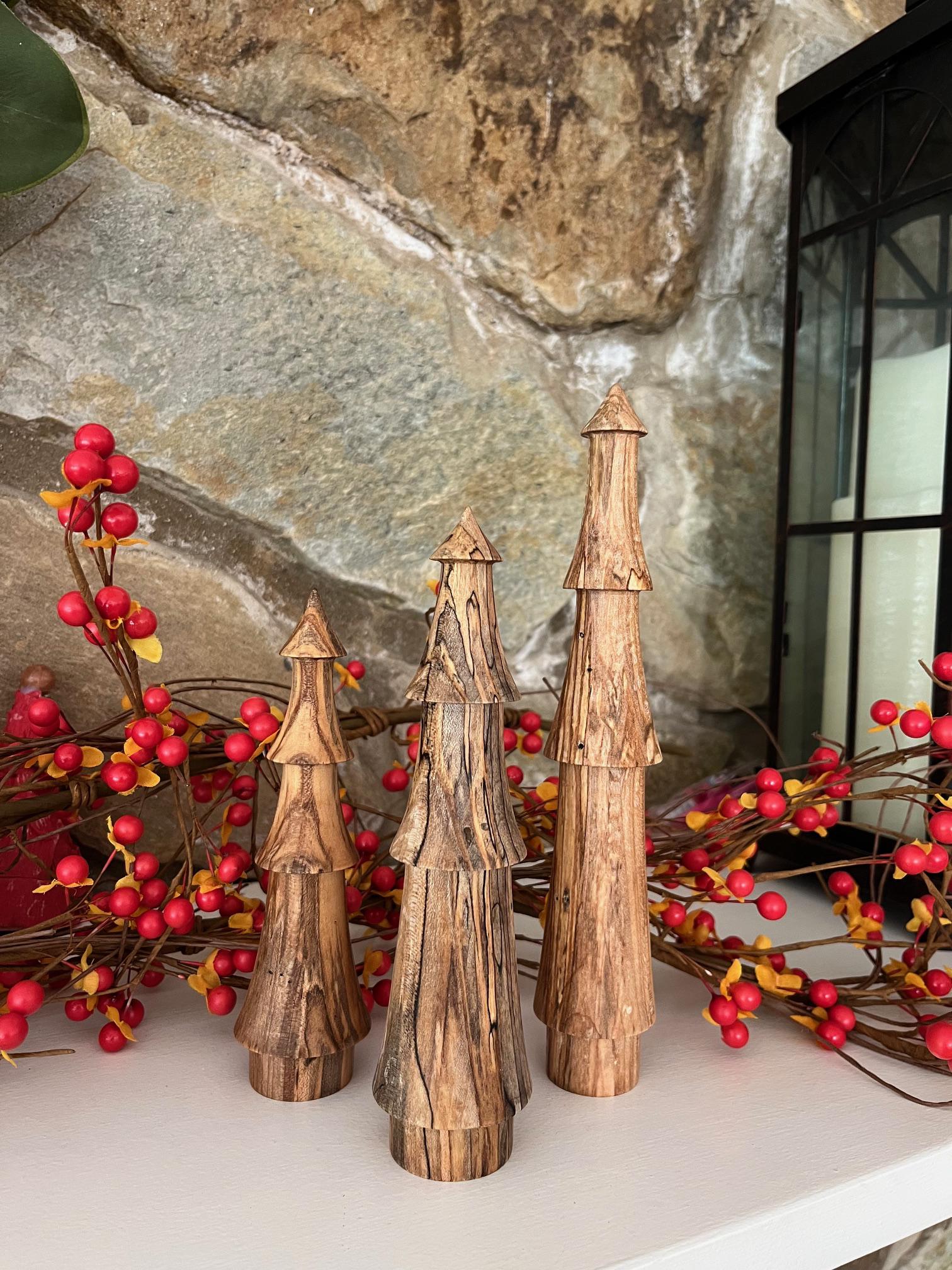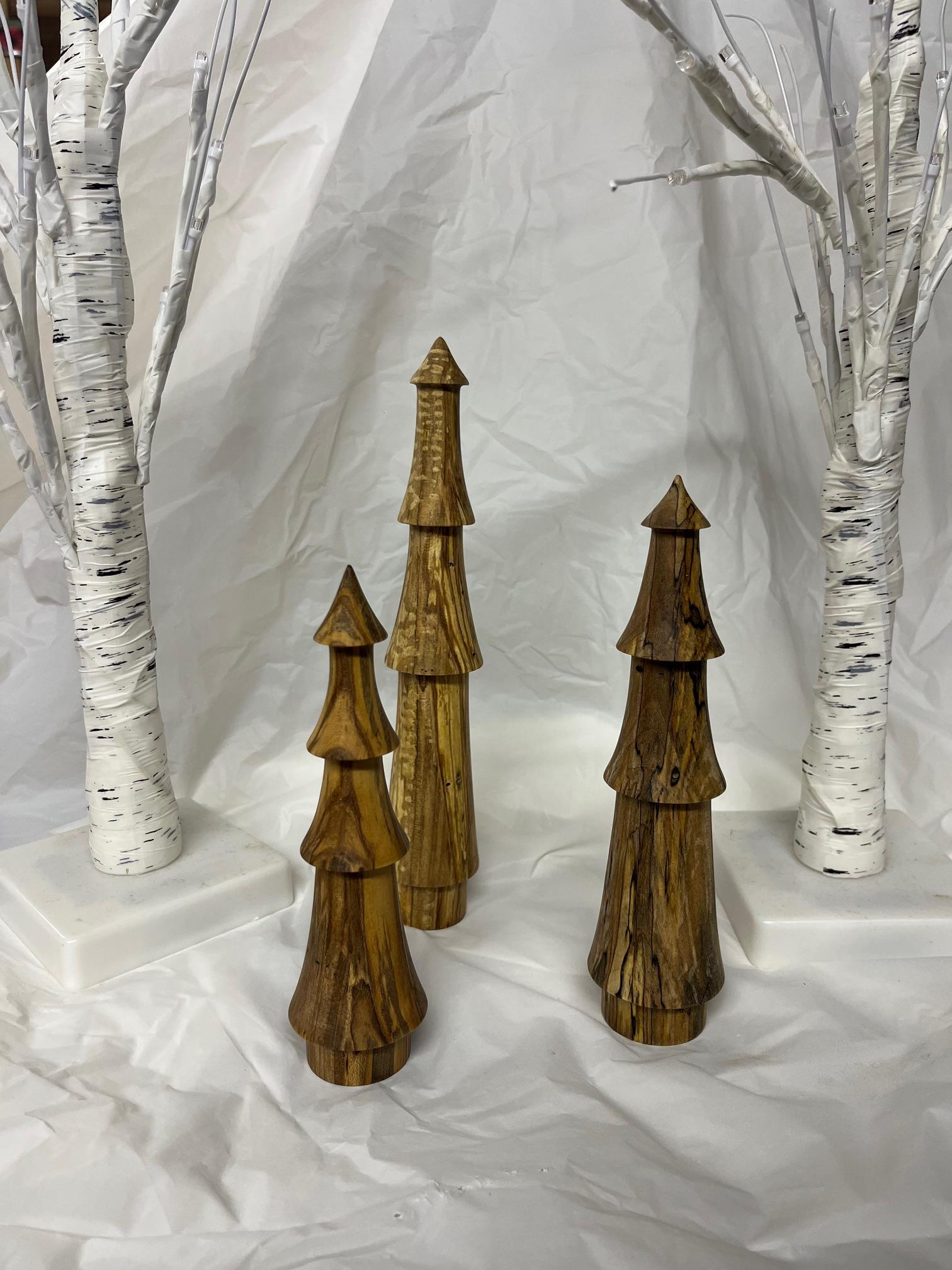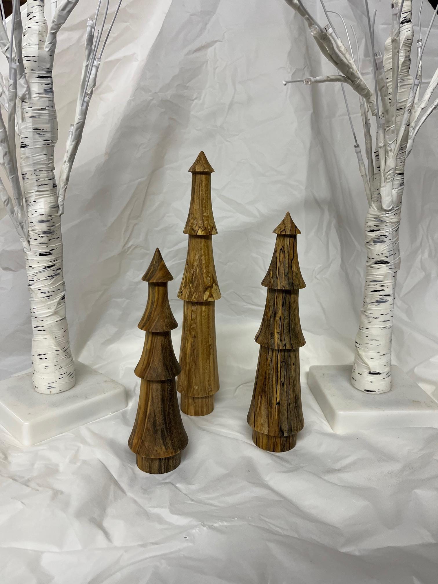 3 Handcrafted Ambrosia Maple Christmas Trees. each one slightly different... The wood has a rustic look with spalting and worm holes on some trees... see pictures for sizing.. standard ruler used